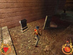 Apply your exit Key to the door and leave this Hall for the time being. Behind the door you’ll find a small graveyard to your left that hides a Bomb. Walk down the passage and open the door. Immediately make a side jump for there’s a sneaky Archer on top of the opposite wall. His arrow will therefore miss Ali so you’ve got sufficient time to jump back and put him to sleep with a well-aimed Knife or a Fireball.