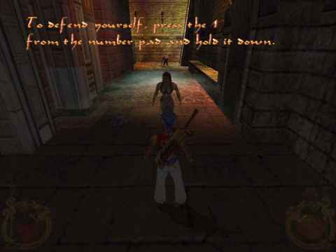 Turn around and proceed till the door. Press action and enter, turn left. In the alley you’ll see a silhouette of Melissa in a cinematic sequence saying “don’t be afraid, come closer”. But it’s a trap. The impostor drops her cloak and unveils a fierce female warrior! A Hunchback and a legless Beggar on a sort of wheelchair are on their way from down the alley to join her in what is to become Ali’s first challenge in combat!