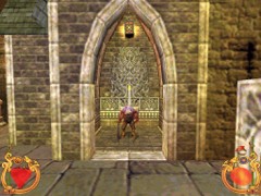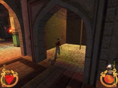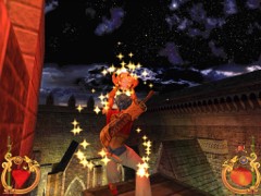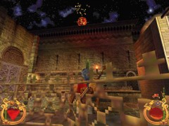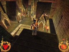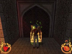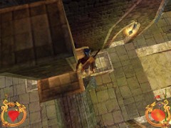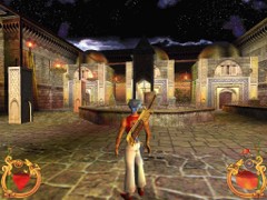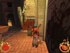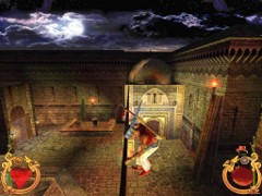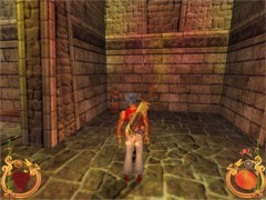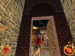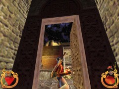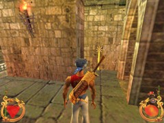Face the door and press action to open. Immediately press forward and Ali will land behind a block while an Archer on top in the left corner just misses him. This is your first magic Spell test. Swiftly climb the block and prepare some magic for the red Ring. Aim and blast a Fireball at the Archer... Aim with the mouse while pressing F1 and release for firing. That will blow him off the wall...