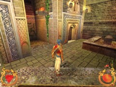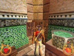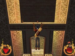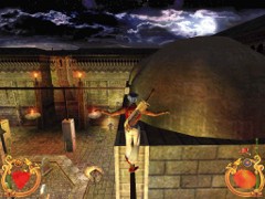 Now survey the left and right walls of the Courtyard from where you’re standing. There is a sealed Mausoleum in the left corner and if you look up you’ll notice a hole in the dome on top. Hmmm…a hole. Against the wall to your right there is a row of 3 other Mausoleums also with a dome on top. The one in the nearby corner is accessible. Go inside and take an empty Phial which is apparently of no use, but perhaps may prove a defensive projectile. Stand on the Tomb, turn to the ledge and jump. Pull up and take 10 Gold Coins, a Phial of Life, a Phial of Magic and a Knife.