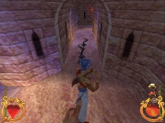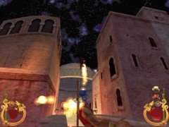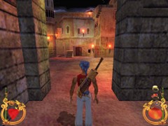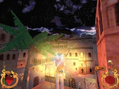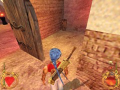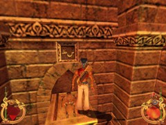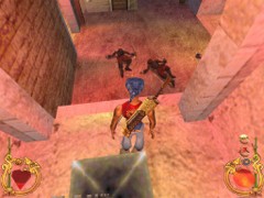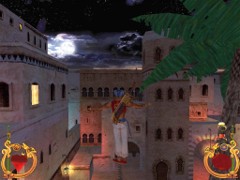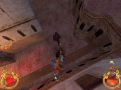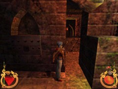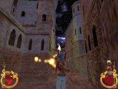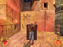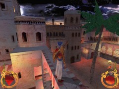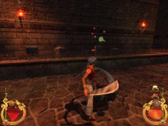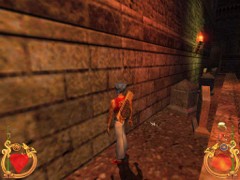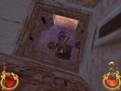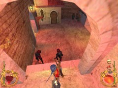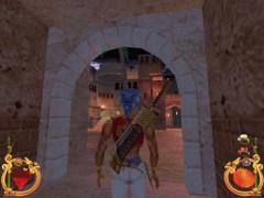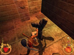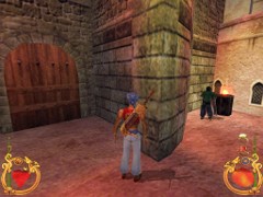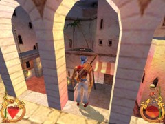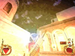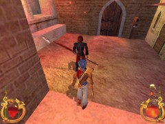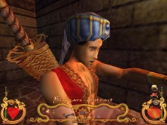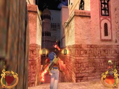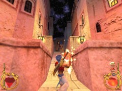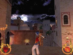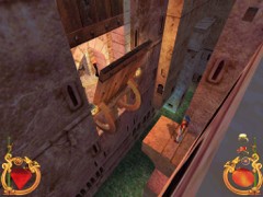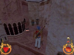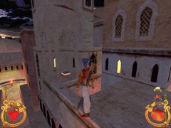 Stand on the corner of this roof and jump to the opposite roof. Climb up and descend the narrow staircases on the other side. Down the third staircase a one-eyed Hunchback Beggar is molesting Ali. Some Kicks will definitely end this kind of bad behavior.