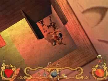 Look down and watch a bunch of angry Scorpions. Throw down a bomb and jump sidewards. Once all the Scorpions are sent to Kingdom Come, jump into the pit and gather altogether 1163 Gold Coins!