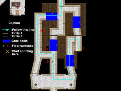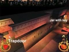 You’ll get 87 Gold Coins there in a Jar. But be careful! Many other Jars contain a Scorpion! Now jump over the gap, but save first. Go further till you see a trap door in the floor. Open it with the wall switch.
