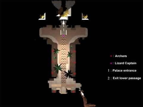 There also 8 Archers spread allover the second floor who won’t notice you as long as you don’t menace the Lizard Captain who is guarding the Palace entrance.
