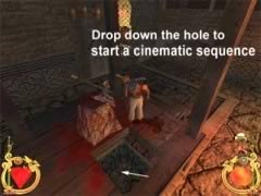 Go down again and take the first passage to the right. You will enter an execution room. Jump on the execution block and drop down in the hole. A cinematic sequence will follow.