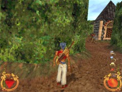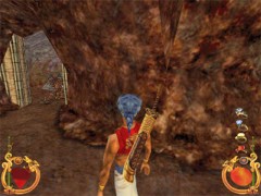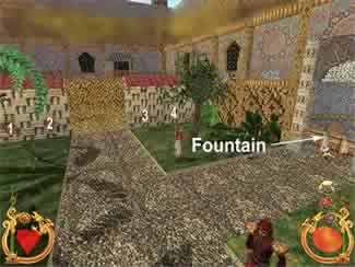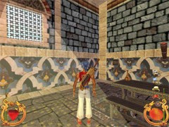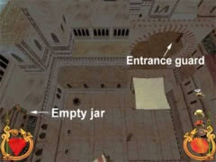 Go all the way back to the Mosque following the staircase behind the door. Halfway turn right and push away the Crate once more. Smash the Jar with 40 Gold coins. The Mosque looks pretty nice in daylight, doesn’t it? There is a Guide whom you must not attack, because he is protected by... Allah or the Genie? So save and kick him. See what happens?