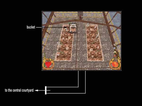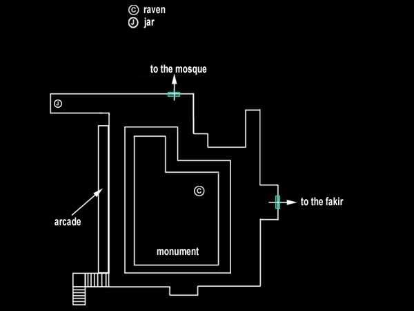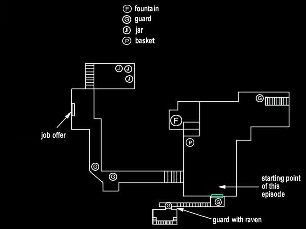 He will leave a corpse of a Raven, so take it. This will come in handy later on. Go up to the stairs. Nothing to do there, so return through the door and take a good look at the central Courtyard.