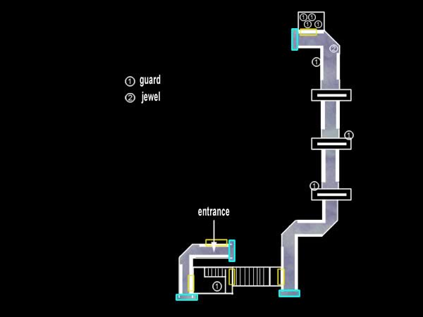 Take care of the four Guards in the room before the exit. You may jump on the gangway, throw a Bomb and jump backwards.