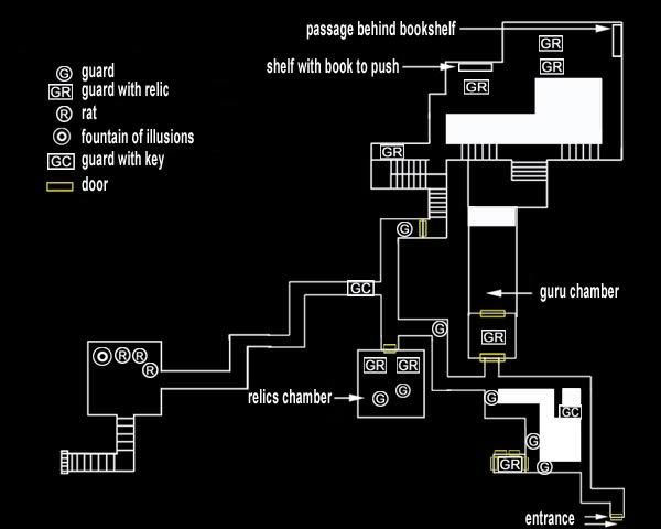 There are two Chambers and a Library, which is your exit. When you have gathered all 8 Relics enter the Relic Chamber. Try to lure the three Guards outside the Chamber one by one and take care of them separately.