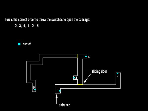 Go all the way to the end of the passage and throw switch 2. This will open a sliding door giving access to a hidden passage. In order to open the second sliding door throw the switches in the next sequence: