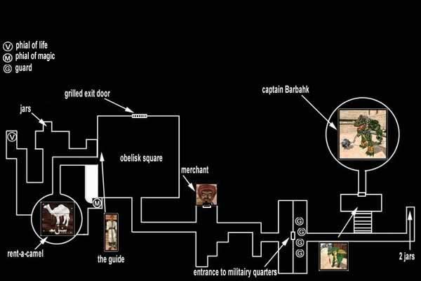Go to the Obelisk Square and talk to the Guard in front of the grilled exit door. Ali will request to leave Town. The Guard replies that Ali will need a Safe-conduct out of Town only to be obtained from Captain Barbahk in the Military Quarters.