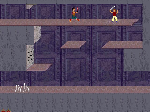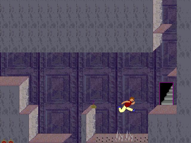 spikes to your right and get hold of the ledge with the closed door. Drop. Run