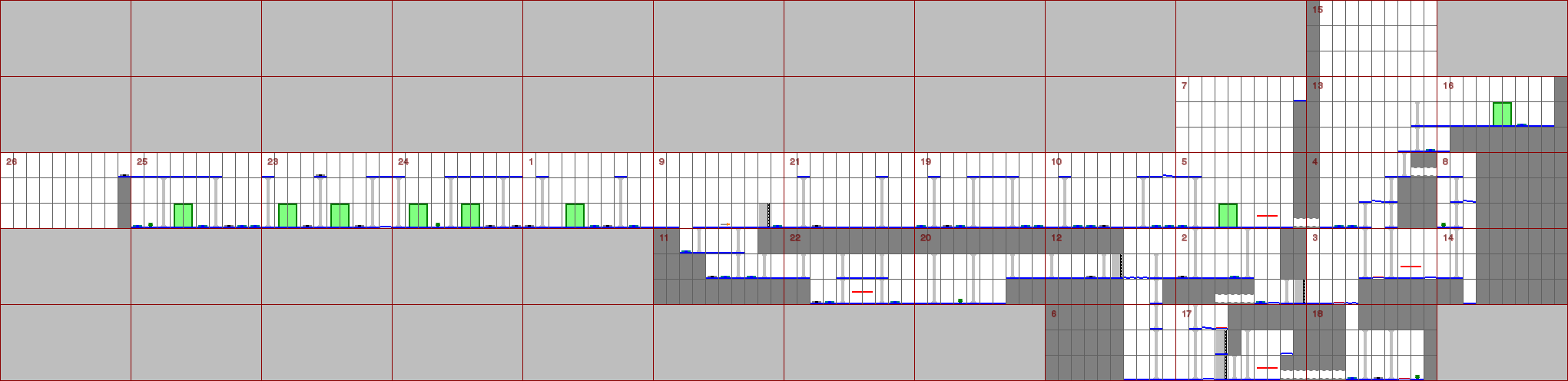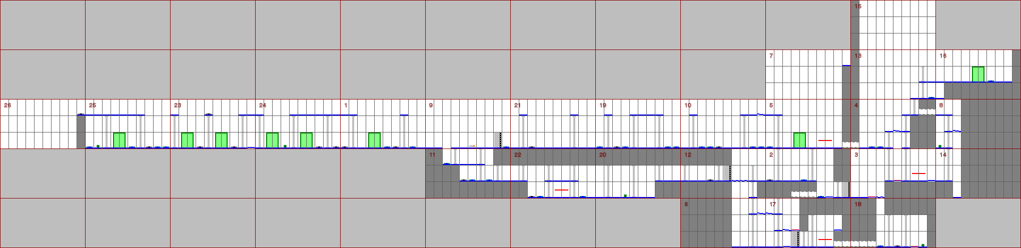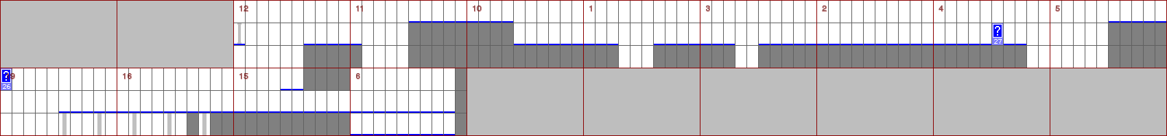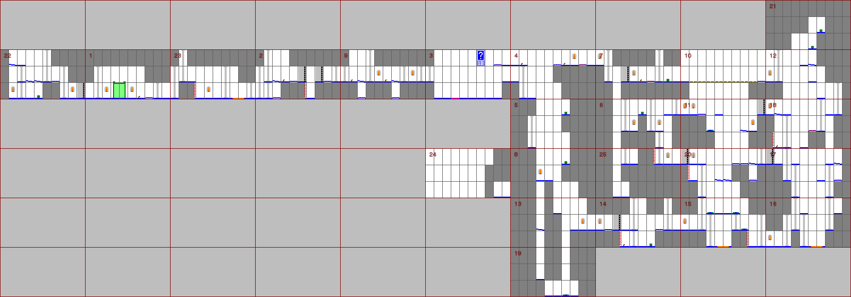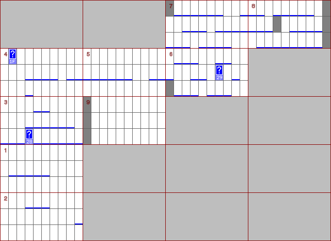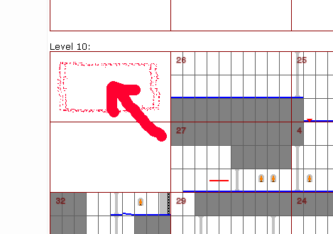 - Blue question marks mostly refer to animation sequences, where I found it unnecessary to create a simplified design for each one. Red question marks all refer to the same tile type, and while I can identify them, I can't substitute them with a single image, since it's used e.g. both for the bridge in level 5 and the flame in level 13. I would need to branch based on the modifier or the level number which I didn't want to. After all, everyone knows what's there :).