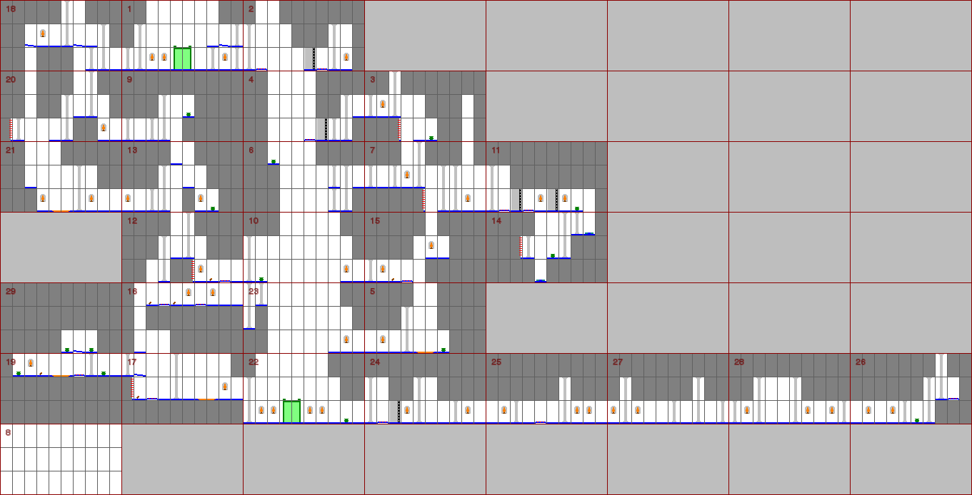 I've also been surprised that the game only contains 14 levels, since I saw 15 everywhere. The reason is that the tower level is already the final one, you only warp to a new room. - The sources for the program I used to generate the images are on my personal webserver here. I don't promise they'll be there forever, so grab it if you need ;). It's gpl'ed and you'll need the ImageMagick library to compile it.- When you go left from room 27 and would enter room 28, you're warped to room 3 and (with the exception of the IR version) the door closes. Touching a floor tile wouldn't work here since you might evade it. To make it possible to go into that room, they must add one to the left. This technique was also used in PoP1 on levels 0, 6, 12 and 14.