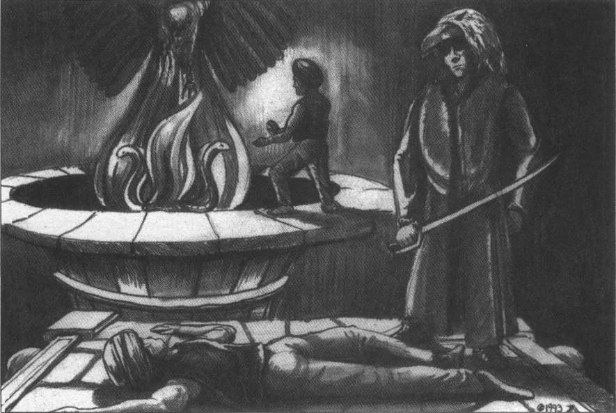 12. An iridescent blue flame flickered in a huge torch. A great statue of an