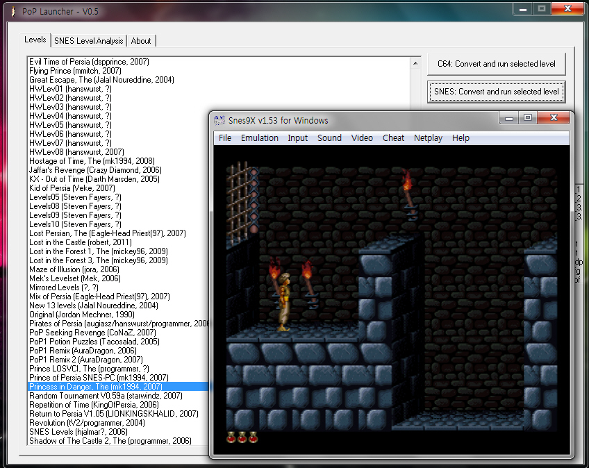 Development of PC-to-SNES level converter is working in progress. Current stage is very primitive. The pack includes custom launcher and the Snes9X emulator is used.
